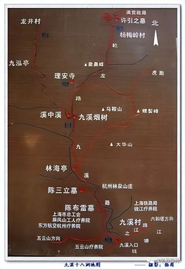 严格地说:"溪中溪"是"九溪"和"十八涧"两条水流的汇合点,以下形成湍急的九溪河水,流入钱塘江。两条水流都发源于鸡冠垅下,不过是一条在山东坡,一条在山西坡。