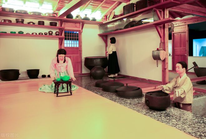 我们模仿着主人的动作,将鞋脱在外边,鱼贯而入。房屋内部的布置也很有特色,一进门就是炕,直通所有房间。炕上铺有花色鲜艳的地板革,显得宽敞、洁净。朝鲜族人至今仍保持着席地而坐的古风,所以室内没有椅子、凳子。炕上白天用作待客、吃饭,晚上铺上棉被就是卧床了。他们的厨房设计十分巧妙,和厅堂同处一室,在客厅的一角挖了一个相当大的炉灶,主妇生火时要跳下去,因为烟道在炕底下通过,生火之后,整个炕面便会有温热之感。夏天可以防潮,冬天可以取暖,非常适应长白山区的气候特点。房屋的内外墙和白灰粉刷,显得整洁而明亮,看上去十分得体。