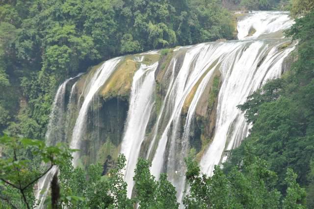 从远处看,只见前方翠竹连天,一片碧绿,以蔚蓝色天空做帷幕,飞流从那绿色的洞府之中奔腾而下,如一匹巨大的白绢悬挂于崖壁之上,微微飘动。她宽约数百米,落差达一百多米,气势极为壮观,那飞瀑跌落犀牛潭中,使得潭水滚沸,明珠飞溅,激起翡翠万千。潭底水雾成烟,缭绕升腾,烟波袅袅,使我们仿佛置身奇异仙境。雾气遇风吹拂,弥漫百米有余,或顺坡而上,或沿河而下,在阳光照射下,彩虹横跨马蹄潭 ,变成了连接飞流直泻,如捣玉崩珠,似千堆白雪的大瀑布两岸的彩桥。导游小姐指着这幅美景,向我们讲述了一个美妙的传说——