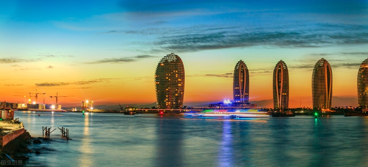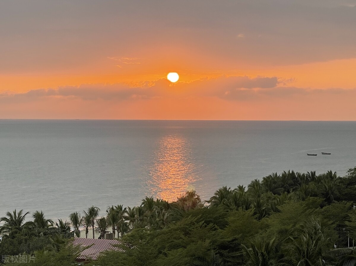 而三亚河畔的黄昏是幽雅恬静的。夕阳高悬在高楼群空隙的云层里,像一个通红晶亮的火球,却完全退尽了白天的灼热,圆圆的,大大的,如害羞的少女躲在轻纱后面闪动的明眸,十分可爱动人。