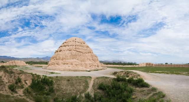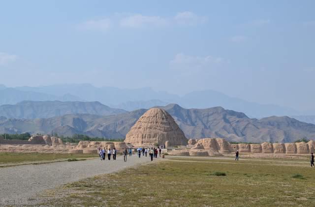 我们走进元昊陵园,见迎面立着两个高大的土柱,有人说那是“门阙”。门阙后有两个低平的土台,说那是碑亭基址。再往里走,是外廊、内城两道板筑的土垣。在中轴线上,有献殿遗址。据介绍,在这里曾经发现过瓦当、滴水,都是绿色琉璃的。献殿后面是塔形“灵台”(坟),全是黄土堆砌。