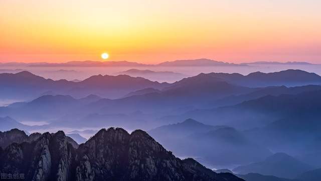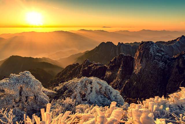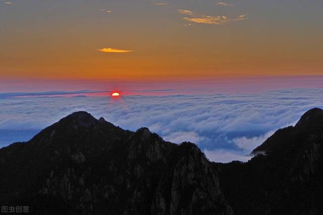 日出是黄山的一大奇观。狮子峰、丹霞峰和光明顶等处都可以看到日出。黄山日出不同于泰山日出,由于泰山矗立于齐鲁平原,登泰山极顶可远眺东海,从真正的海水中遥望旭日从海中跃出,万紫千红,极为壮观。所以自古以来就有“登泰山以观沧海”的说法,因此闻名于世。黄山是群山,坐落在皖南万山丛中,而黄山又是皖南万山丛中的最高峰,可以极目远眺。