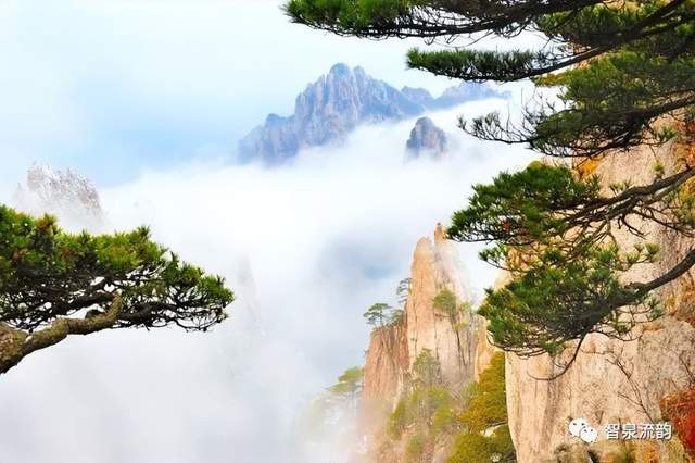 云山重叠中的黄山日出又是一番景色。我凌晨4时就起床来到了清凉台,这座台突出在三面临空的危岩上,靠在石栏上就可以俯瞰和远眺黄山西海一带的全部景色。我们在黎明的曙色中等待了大约半个钟头,才看到旭日露出小小的一角,辉映着朝霞,赛似刚从高炉里倾泻出来的钢水,光芒四射,令人不敢张开眼睛直视。过了一会儿,红日冉冉上升,光照云海,五彩纷披,灿若锦绣。那时恰好有一股强劲的山风吹来,云烟四散,峰壑松石,在彩色的云海中时隐时现,瞬息万变,犹如织锦上面的装饰图案,每幅都换一个样式。这样的景色,就是在彩色图片和彩色电影、电视中也很难看到。