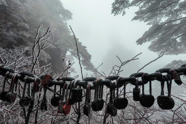 这次登黄山,给我留下历久难忘深刻印象的是天都峰顶铁索链上那各式各样大小不等的“连心锁”。我们亲眼看到几对青年男女登上天都峰后,感情激动,引吭高歌。他们偎依在一起,把两颗心铸成铁锁,锁在天都峰顶,希望它能锁住他们的爱情。据说在婚后度蜜月的日子里,有的还要再来一次黄山,把那把经过风吹雨打,冰冻雪压,受过各种磨难的锁带回去锁在新房门上,然后换把新锁锁在原处。