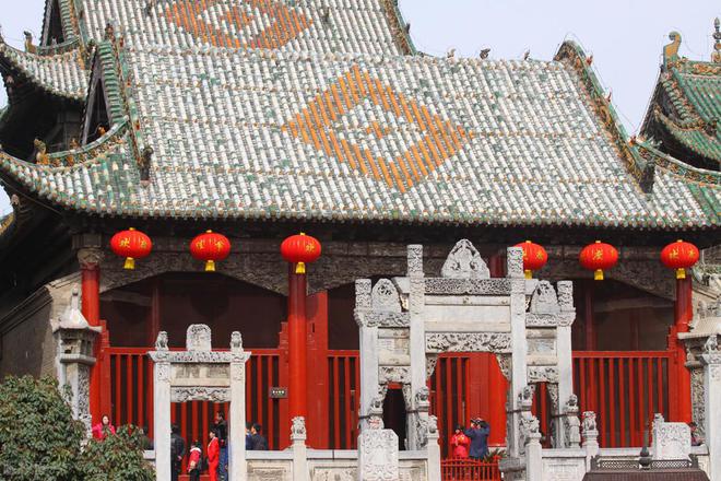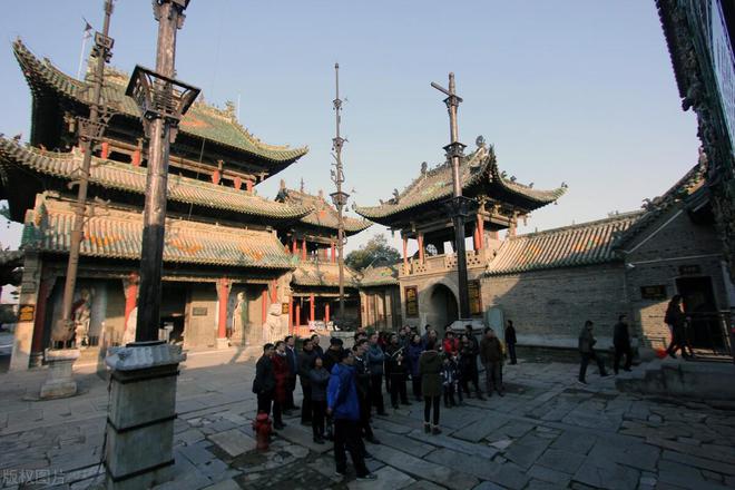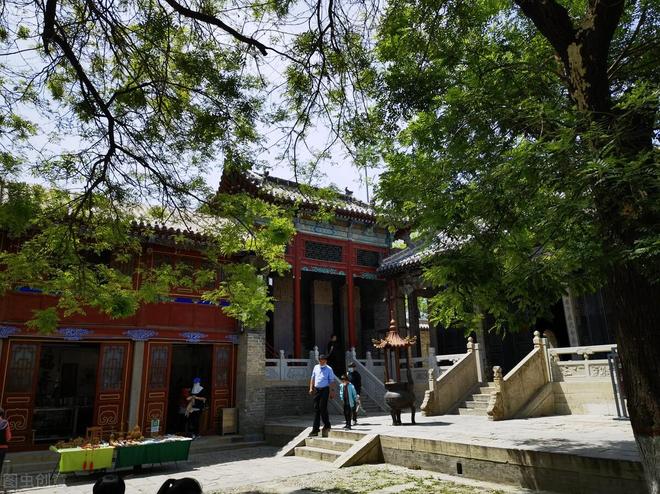 三点多时来到了新建不久的高大的门额上刻有金色的“山陕会馆”门前,八字型的院墙两旁是雕工精细形象威武的灰色的秦琼、敬德两个门神。推开新做不久的木门,掂着车子过了门槛。迎面就看到一座高大的彩牌楼,大门西面是一排不太高的平房。空旷的院里只有彩牌楼周围有些树,牌楼北面是没有了南、北墙的拜殿,拜殿后是一幢三层高的新式教学楼。