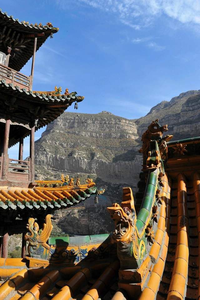 我们在寺里烤干了衣服,一边听僧人介绍,一边环顾四周,只见悬空寺红墙灰瓦,座北朝南,仅150多平方米的面积就有殿堂楼阁40多间,错落有致,曲折回环,虚实相生。计有三佛殿、太乙殿、关帝庙、鼓楼、钟楼、伽蓝殿、送子观音殿、地藏王菩萨殿、千手观音殿、释迦殿、雷音殿、三官殿、纯阳宫、三教殿、五佛殿等。有的以栈桥飞渡,有的设暗道相通,有的可攀登石级而上,有的须横穿石壁而到达。我发现了一处最令人怵目惊心的地方:在寺北端的悬崖上,凌空“挂”着两座三层飞檐高楼,南北对峙,楼与楼之间隔着数丈宽的断崖,仅以栈道连接。我试着踏上了栈道,听到脚下木板发出了吱吱吱的响声,顿时惊出一身冷汗。正如李白诗云:“夜宿峰顶寺,手可摘星辰。不敢高声语,恐惊天上人。”此时此刻,我犹如置身世外,有飘然出尘之感。