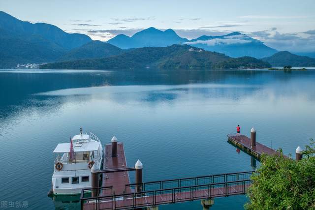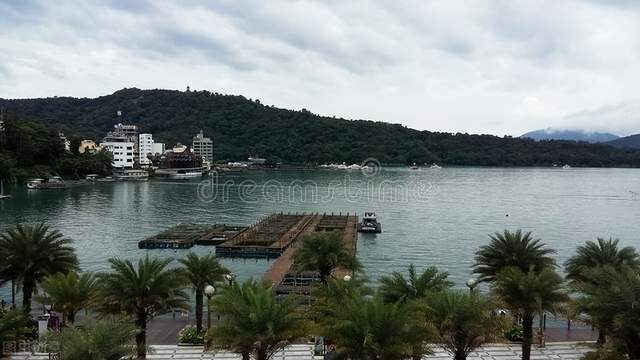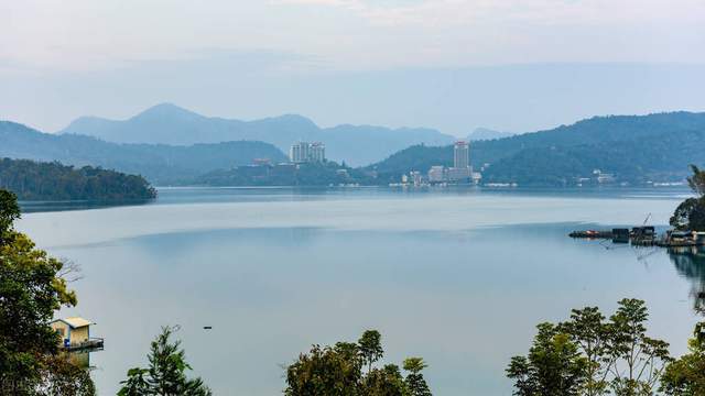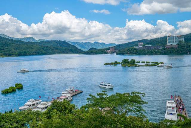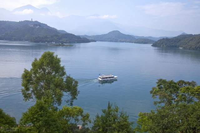 我们的游船朝着湖心驶去,停靠在了木桥旁,我们登上光华岛。岛上长着许多不知名的草本植物,金黄色的小花点缀其间,独具亚热带自然风光。岛上的“玉岛神社”坐西向东,有2座坊门和一座“玉岛祠碑”。岛中央有几株树,有点像阿里山上的红桧,后来导游说是龙柏。虽饱经风霜,倾斜的树身仍傲然屹立。树旁古朴的小亭里,有一尊表现捕鱼生活的雕塑,那是世世代代生活在日月潭地区的原住民生活的缩影。导游说每年中秋月圆之夜,当地原住民青年男女就会聚集在日月潭边,跳起古老的舞蹈,重演古老的故事。这古朴的小亭也成了情侣们表达忠贞爱情的爱巢。