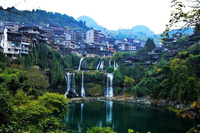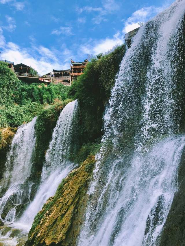 从码头向左望,可见芙蓉镇瀑布和其旁建在悬崖边的飞水寨。五里石板街见证了古镇几千年的历史变迁,在2300多年的历史中,芙蓉镇作为水陆交通的要塞,一直是通商的黄金口岸。据史书记载,在清朝乾隆、嘉庆、道光年间芙蓉镇的店铺就有560余家,每日骡马千余、商贾云集,一派繁荣景象,素有“小南京”之称。而今的古街虽说缺了身着长袍立于高柜的风景,街两旁却也摆满了琳琅满目、富有古镇特色的精美物品。而时而出现的古镇米豆腐,拾级而上的石板街,更是把人拉入了刘晓庆与姜文主演的《芙蓉镇》电影场景里,别有一番风味。芙蓉镇大瀑布——缔造瀑布上的千年古镇瀑布是芙蓉镇首屈一指的天然美景,任何到芙蓉镇的人都必到瀑布。顺着狭窄弯曲的石阶廊下山,还没到山崖底下,便已经听到了震耳欲聋的瀑布声。土司行宫可以说是前有照后有靠,悬崖下面是一湾河水,可谓一块风水宝地。