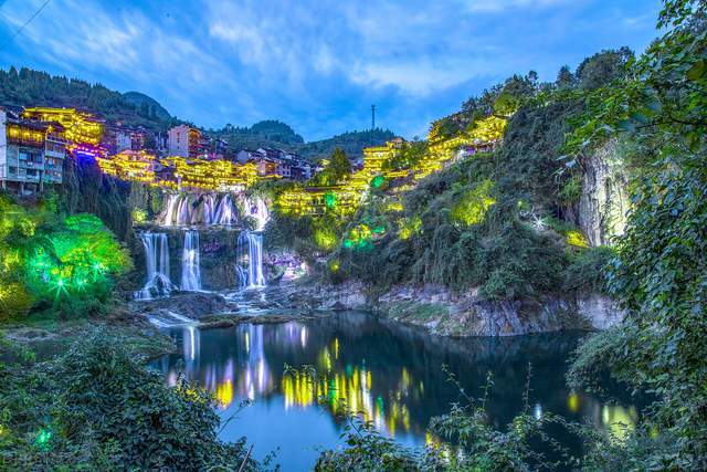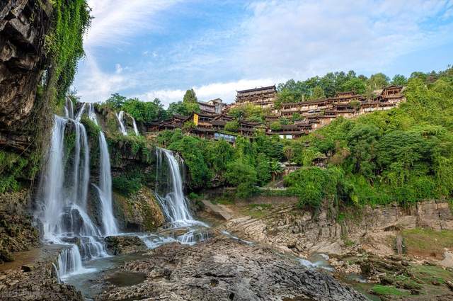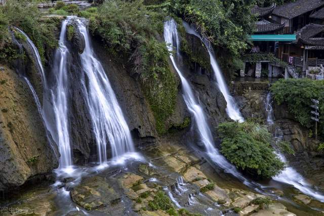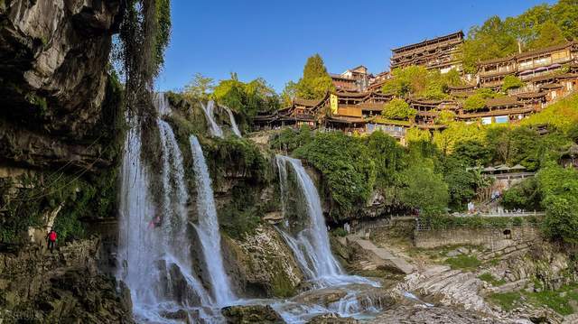 王村于我,既是山水名篇,也是史诗传奇;既是过客,也是常客。芙蓉于我,既在花里,也在花外;既是俗人,也是骚客;无论我进出古镇多少回,待多长时间,画里画外我只浅识皮毛、画出简单的轮廓,唯有虔诚敬奉,顶礼膜拜,欢欣流连。土司行宫(飞水寨)——传说中的吊脚楼群在集镇上有此瀑布者在全国并不多见,瀑布旁的“土王行宫”更是芙蓉镇的一大亮点。这里是当年富甲一方的土王所选择建造避暑山庄的地方,一夫当关,万夫莫开。行宫侧面是悬崖峭壁,宫前溪水长流,飞瀑直泻,震耳欲聋,气势蓬勃。“小背篓,晃悠悠,笑声中妈妈把我背下了吊脚楼……”这是宋祖英歌里质朴风情的吊脚楼。吊脚楼,土家语称“咧嘎”,是土家人民居住生活的场所。