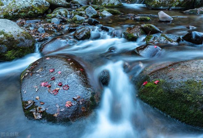 弯弯曲曲的栈道,弯弯曲曲的山谷,顺山谷远望,两侧山峰和林木把天空也镶嵌成弯弯的一条狭缝,山谷中的溪水在欢快地奔流,溪水清凉而清澈,水面上时而飘着随风落下的枫叶,奔向远方,去传递着秋的讯息。谷底到处是被溪水常年冲刷得光滑、长满青苔的大大小小的卵石和石块,白色的水流,青色的石块,溪边绿草红枫,游览在山谷溪边,如同进入到一个幽静而神秘的世界。一阵微风吹来,枫叶如同万千片小小的风铃,随风摇曳,飒飒作响。整个峡谷,处处是美景,真是五步一风景,十步一重天啊。清幽宁静的溪弯、花团紧簇的青山、映照蓝天的碧水、神奇秀美的悬流飞瀑,这里的自然山水给人以超凡脱俗之感、是一幅人间难得的奇美画卷。