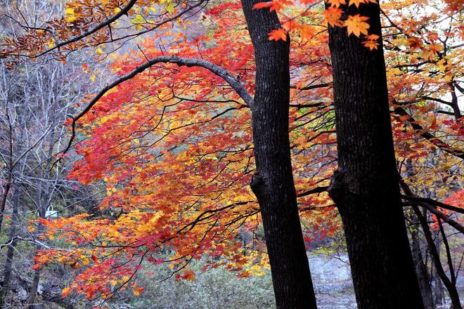 为了能看到“枫王”,我们不能在所有的景点流连太长时间,只能每到一处看一眼,留个纪念,便匆匆向最后的目的地进发。越向山里走,景点越多,越引人入胜,枫叶也越来越红,越来越奇,被挂上标签的珍贵树木也越来越多。月台子景区是枫叶观赏的主要景区,太多的美景数不胜数,真慨叹我们的时间太短了。