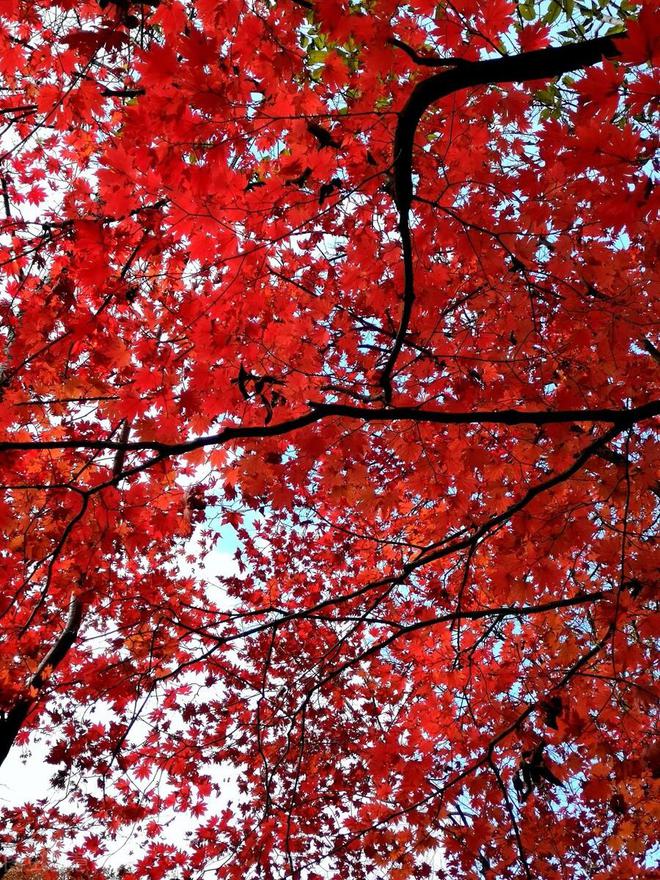 终于看到“枫王”了,这是一簇长着许多枝干的枫树,枝干都是从一个根底部生长出来的,看来这株枫树的年头一定很长了,从根部的老根可以看出,要不怎么能称得上“枫王”呢。看到“枫王”多少有些遗憾,“枫王”的叶片大多已经落了,看来“枫王”是这里最先红的枫树了。虽然如此,我们也能从它的姿态上看出,这株枫树非它“枫”而能比。“枫王”周围的游人很多,都是对它心怀期盼的人们,我们赶紧留下几张照片,作为永久的纪念了。