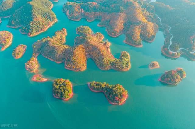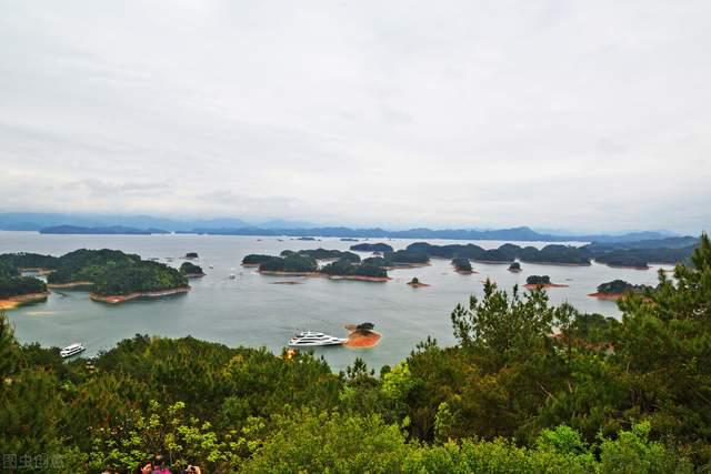 放眼望去,浩渺万倾,千岛竞秀,群山叠翠,若隐若浮间,千岛湖如碧玉翡翠,如一丸螺黛,更宛如一个亭亭玉立的少女,静卧于千岛秀峰之间。那其中一湖浩渺的蓝,与四周一片葱笼的绿融为一体,更兼远处那星罗棋布,碧绿如黛、层层叠叠的小岛,似绿非绿,似蓝非蓝,真个有“春来江水绿如蓝”的感慨。