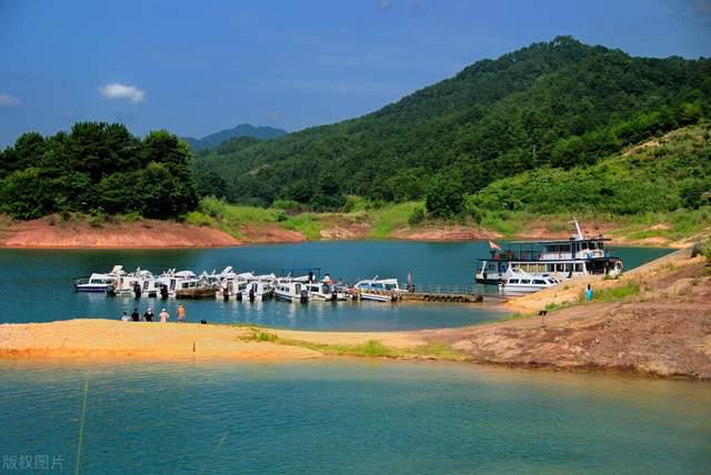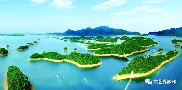游艇在湖面飘移着,我深深呼吸“农夫山泉”散发的香甜气息,浑身舒展自如,完全不能自拔,相融于山青水秀之间。“哇!睡美人,睡美人,”我惊叫了起来。整个山峦凹凸有致,平卧于湖面之上,双眸仰望于天。仿佛在祈福上天:风调雨顺,五谷丰登,国泰民安;高挑的乳峰敖立于群峰之间,预示着千岛湖的水源源不断,取之不尽,饮之不完,清澈透明而甘甜可口。或许就是"农夫山泉"取之于处的奥妙吧! 我完全沉醉于那美丽的睡美人之中,正是想用什么词语来赞美一番,却不知不觉,黄金带耀入我的眼帘。因整个山体表面肤色如黄金,故名黄金带。由于建新安江水电站拦江筑坝蓄水,淳安和遂安两座千年古城、五大集镇、30万亩良田及绝大部分基础设施沦为水域,29万人移居他乡,心情就不再是激动,而是沉思了。