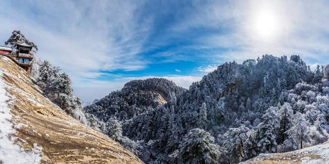 我们沿着幽幽曲径,过二仙龛、迎阳洞,来到了海拔两千零九十米的朝阳峰。晨露打湿了我们的衣服,东方地平线由乳白渐泛赭黄,金辉四射;刹时,红日喷薄欲出,红色、金色、紫色的万丈光芒,在整个东部天空舒展开来,把半个天穹都铺满了。片刻,红日就像一颗刚从水中飘出的巨大气球,冉冉上升。黄河犹如一条金色巨龙,向着金辉耀目的太阳飞奔,红波闪闪,霞光熠熠。东海水雾,下系黄河金带,上托云霞红日,光彩夺目,雄伟壮观。极目眺望,关外的中原大地飞霞流彩;身后的秦岭和昆仑尚在雾霭中晨眠,似与华山浑然融为一体,正像朱德元帅诗中所写的那样:“华山直挺黄河边,雄视东方函谷关,西接昆仑成一脉,千峰万壑护中原。”