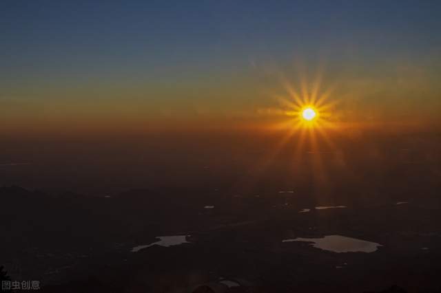 早霞慢慢变浓变深,粉红的颜色,变成了橘红,又变得鲜红一片。大海、天空、泰山,也都像起了火似的,通红一片。刹时,红日喷薄欲出,红色、金色、紫色的万丈光芒,在整个东部天空舒展开来,把半个天穹都铺满了。片刻,红日缓缓离开了地平线,开始像一盏扁圆的宫灯挂在空中,霎时,便形成滚圆的火轮,高高升起,喷射出万道金光!黄河犹如一条金色巨龙,向着东方飞奔,红波闪闪,金光熠熠。东海水雾,下系黄河金带,上托云霞红日,光彩夺目,雄伟壮观。在那太阳刚刚跃出的海面上,金光特别强烈,仿佛是无数个火红的太阳,铺成了一条又宽又亮又红的海上大路,从太阳底下,一直伸展到泰山极顶。这路,金晃晃红彤彤地,又直又长,看着它,就仿佛使人觉得:循着这条金晃晃红彤彤的大路,就可以一直走进那太阳里去。
