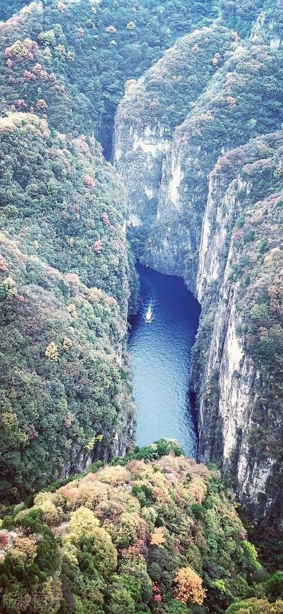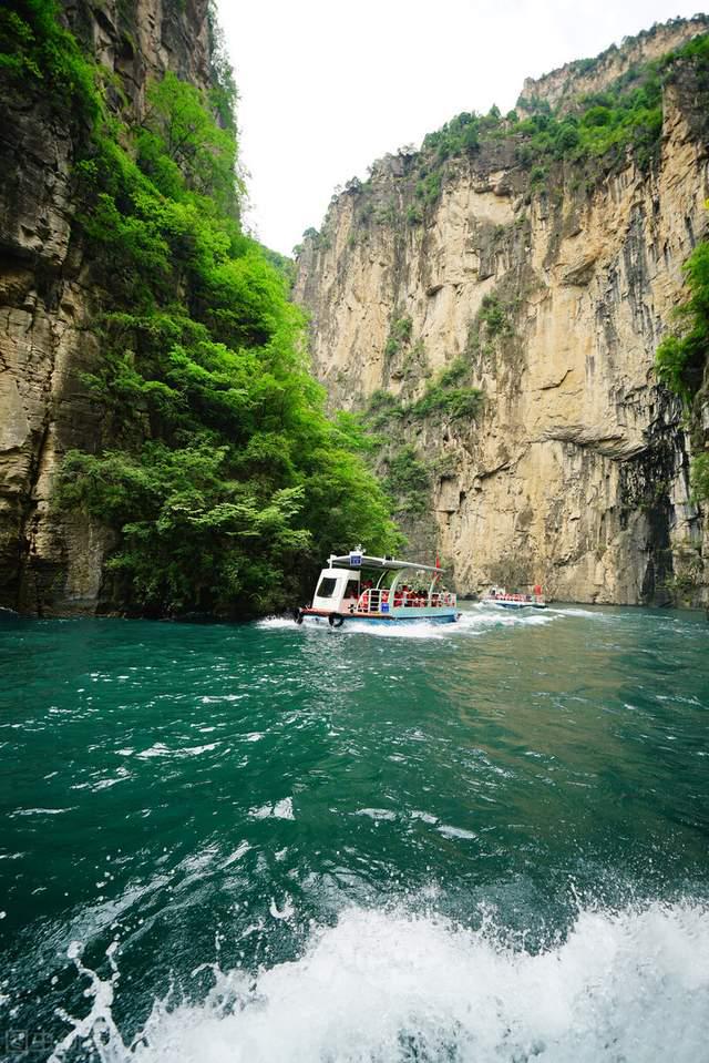 峡口修建的发电站,形成了一道弧形的瀑布冲天而下,气势磅礴的又一道景观。峡口的码头,坐落在群峰环抱的一泓碧水中。碧水犹如翡翠,赛若四川九寨。泛舟湖上,船儿击水,峰回路转,荡舟湖面或逆流而上,环顾两岸,绝壁如削,对峙高耸,雄伟壮观,撼人心魄,声若洪钟,使雄伟壮观的峡谷,增添了无尽的灵气,无愧“太行第一水峡”之称。船在其中,犹如小车行驶在高楼林立的城市街巷。阳光下,如镜的水面被小舟犁开,一道波纹剪开了青山的倒影,置身于这山清水秀的画廊里,沐浴着清凉而湿润的山风,令人心旷神怡!