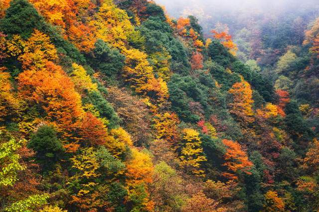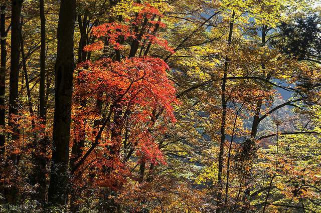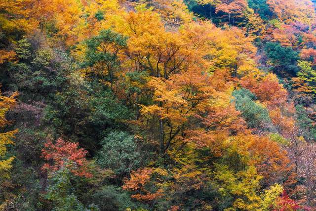 三是周期长,景色分明。观赏红叶时间为每年的10月中旬至11月底,长达一个多月之久。第一个阶段看红叶五彩斑斓,第二个阶段看红叶层林尽染,第三个阶段看红叶万叶飘丹。四是种类多,内容丰富。光雾山红叶属落叶阔叶类乔木,有水青冈类、枫树类、椴树类、稠李类、漆树类、槭树类、桦木类、杨树类、松树类和檫木类等20余类,还有蔷薇科类和四照花类等植物,共有40多种。红叶形状有手掌状(如三角枫、八角枫),鸡爪形(如鸡爪槭)、五星形(如五角枫)、羽毛状(如盐肤木等)、心脏形(如青榨槭)、船形(如稠李类)、卵形(如水青冈类)、豆瓣形(如栓翅卫矛类)、椭圆形(四照花类)、针形(如落叶松)、扇形(如银杏)、鸭掌形(如檫木类)等20多种形状。