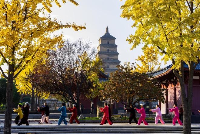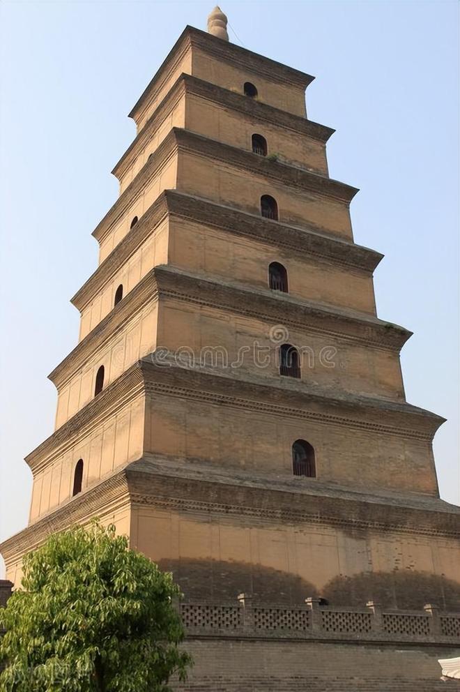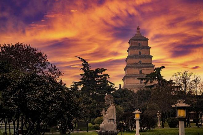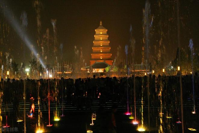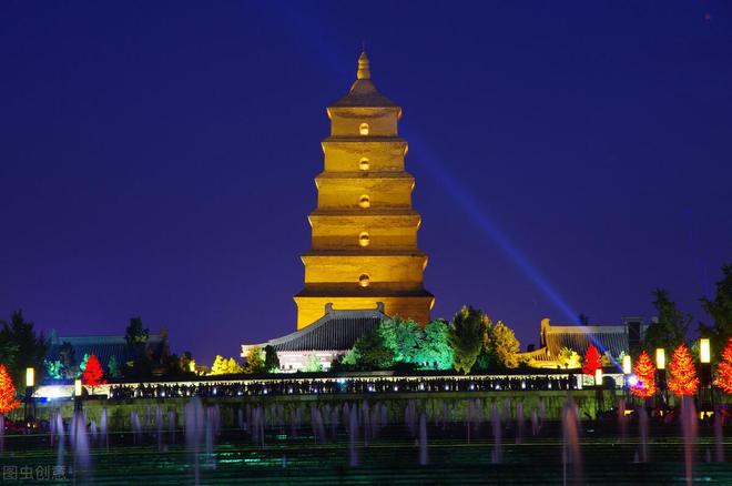 说起大雁塔的来历,还有一个有趣的故事呢。传说佛主的弟子在做功课的时候想试一下佛主究竟灵不灵验,就想:如果现在有肉吃该多好啊。恰好此时天上飞过一群大雁,就掉了几只大雁在那个弟子身旁,把弟子吓到了,连忙忏悔。后来就在大雁落下的地方建起了雁塔。唐三臧去印度取经回来后,也依样画葫芦,在西安建了雁塔,并担任了第一任主持。他的许多经文都是在这儿完成的。在雁塔前加上大字,是为了与小雁塔区分,同时也是为了显示这塔的特点:高大健壮。一共有七层,每层有九米高,相当于现代化建筑的21层楼房。雁塔的外观是灰黑色的,高高的矗立在宽阔的广场中央,成了西安的标志性建筑。